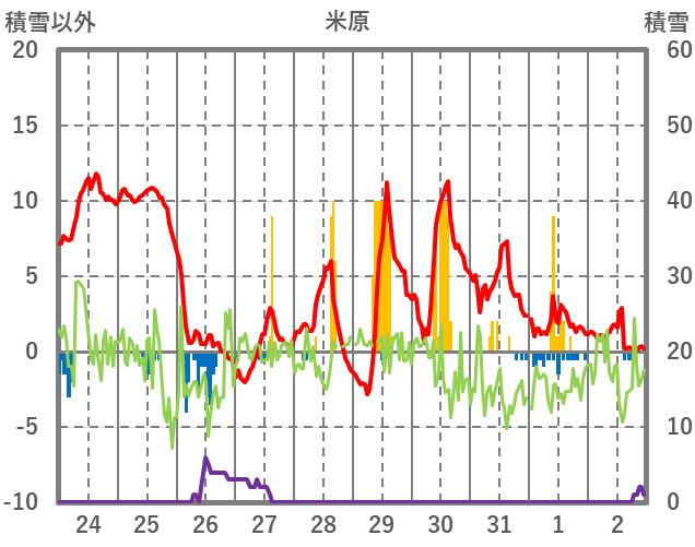 | 日 | 時 | 気温 | 降水 | 風向/風速 | 日照 | 積雪 | 降雪 |