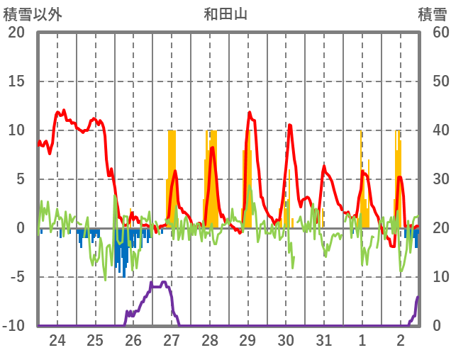 | 日 | 時 | 気温 | 降水 | 風向/風速 | 日照 | 積雪 | 降雪 |