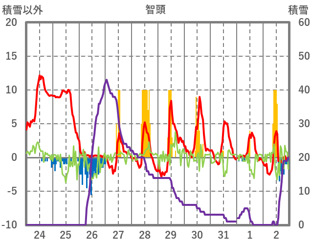 | 日 | 時 | 気温 | 降水 | 風向/風速 | 日照 | 積雪 | 降雪 |