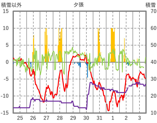 | 日 | 時 | 気温 | 降水 | 風向/風速 | 日照 | 積雪 | 降雪 |