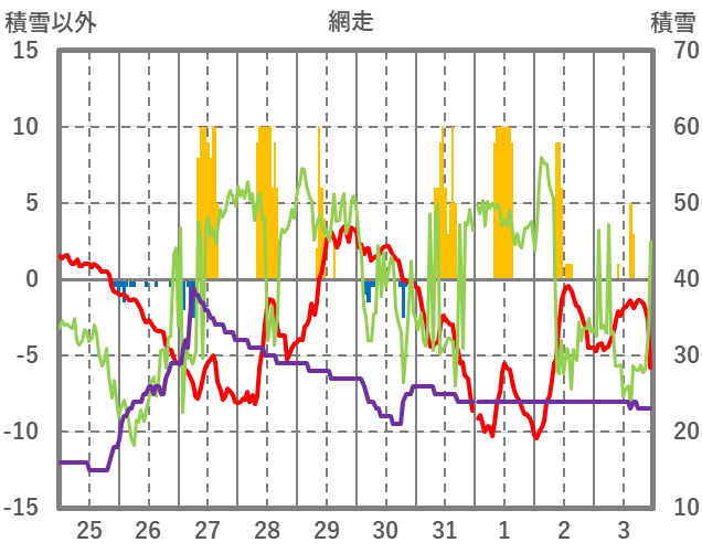 | 日 | 時 | 気温 | 降水 | 風向/風速 | 日照 | 積雪 | 降雪 |