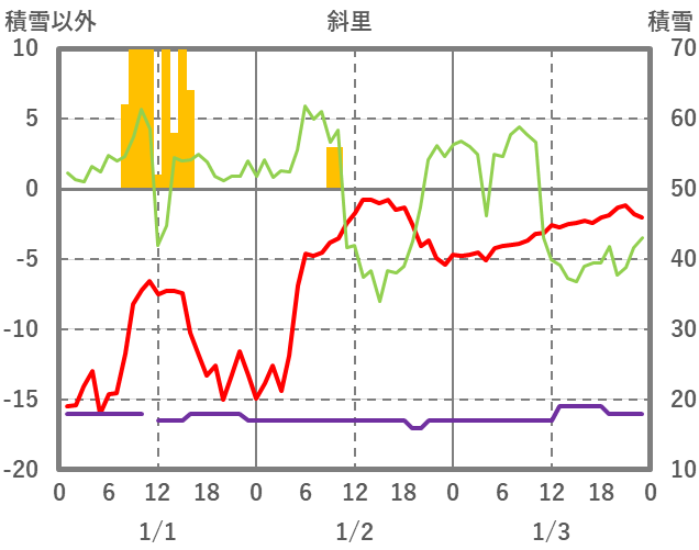 | 日 | 時 | 気温 | 降水 | 風向/風速 | 日照 | 積雪 | 降雪 |