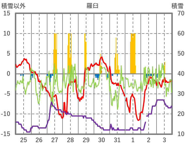 | 日 | 時 | 気温 | 降水 | 風向/風速 | 日照 | 積雪 | 降雪 |