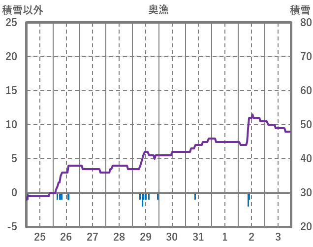 | 日 | 時 | 気温 | 降水 | 風向/風速 | 日照 | 積雪 | 降雪 |