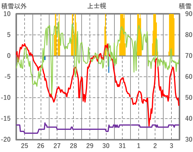 | 日 | 時 | 気温 | 降水 | 風向/風速 | 日照 | 積雪 | 降雪 |