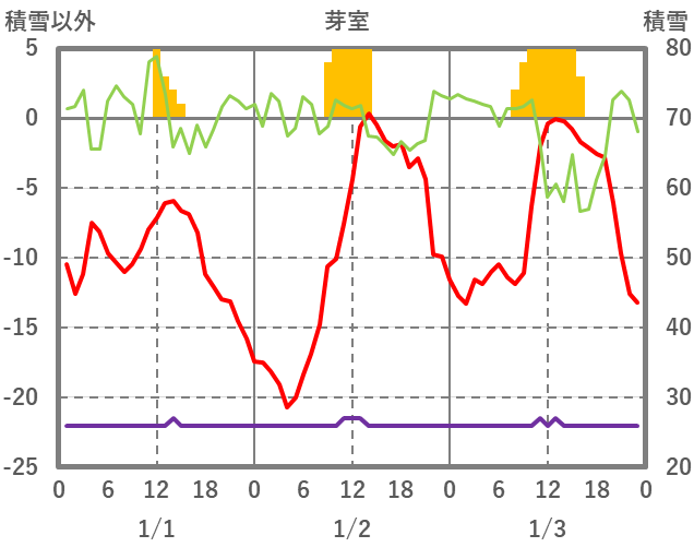 | 日 | 時 | 気温 | 降水 | 風向/風速 | 日照 | 積雪 | 降雪 |