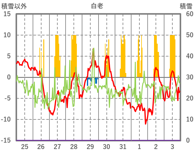 | 日 | 時 | 気温 | 降水 | 風向/風速 | 日照 | 積雪 | 降雪 |