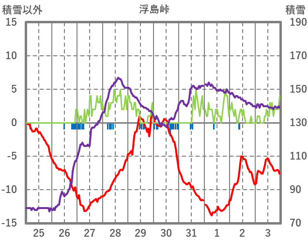 | 日 | 時 | 気温 | 降水 | 風向/風速 | 日照 | 積雪 | 降雪 |