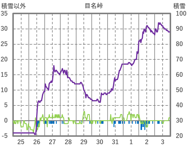 | 日 | 時 | 気温 | 降水 | 風向/風速 | 日照 | 積雪 | 降雪 |