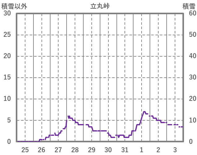 | 日 | 時 | 気温 | 降水 | 風向/風速 | 日照 | 積雪 | 降雪 |