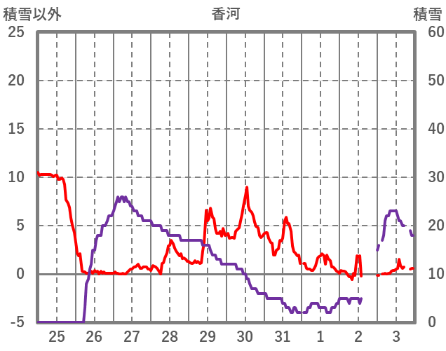 | 日 | 時 | 気温 | 降水 | 風向/風速 | 日照 | 積雪 | 降雪 |