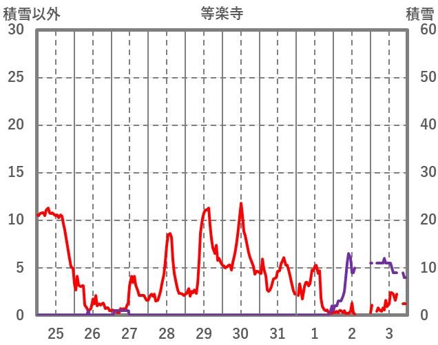 | 日 | 時 | 気温 | 降水 | 風向/風速 | 日照 | 積雪 | 降雪 |