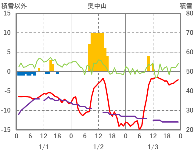 | 日 | 時 | 気温 | 降水 | 風向/風速 | 日照 | 積雪 | 降雪 |