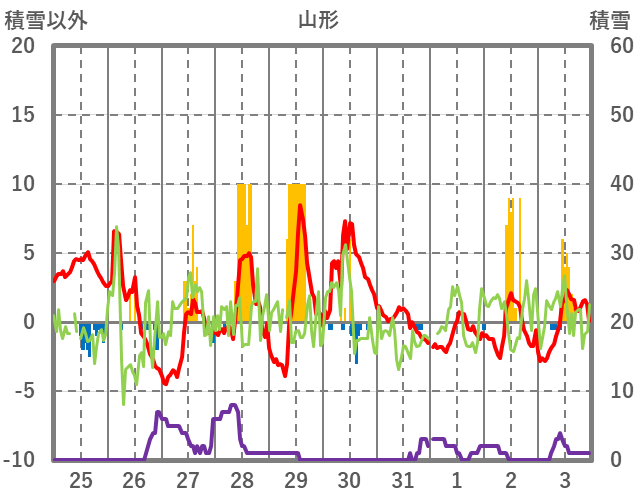 | 日 | 時 | 気温 | 降水 | 風向/風速 | 日照 | 積雪 | 降雪 |