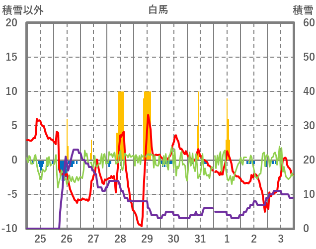 | 日 | 時 | 気温 | 降水 | 風向/風速 | 日照 | 積雪 | 降雪 |