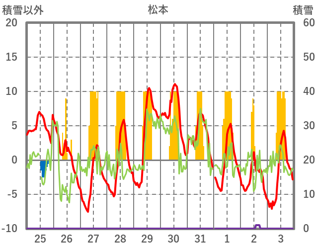 | 日 | 時 | 気温 | 降水 | 風向/風速 | 日照 | 積雪 | 降雪 |