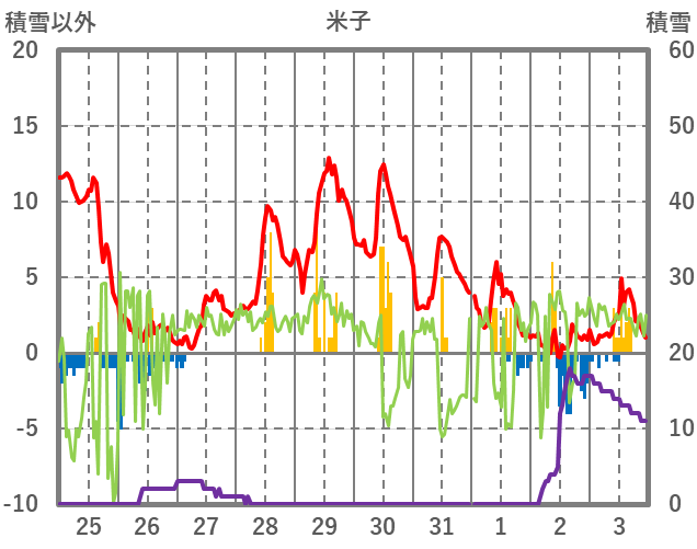 | 日 | 時 | 気温 | 降水 | 風向/風速 | 日照 | 積雪 | 降雪 |