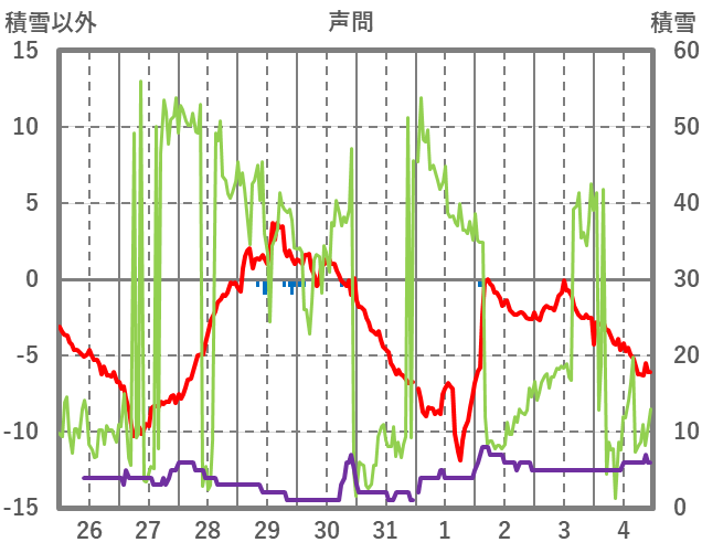 | 日 | 時 | 気温 | 降水 | 風向/風速 | 日照 | 積雪 | 降雪 |