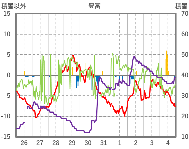 | 日 | 時 | 気温 | 降水 | 風向/風速 | 日照 | 積雪 | 降雪 |