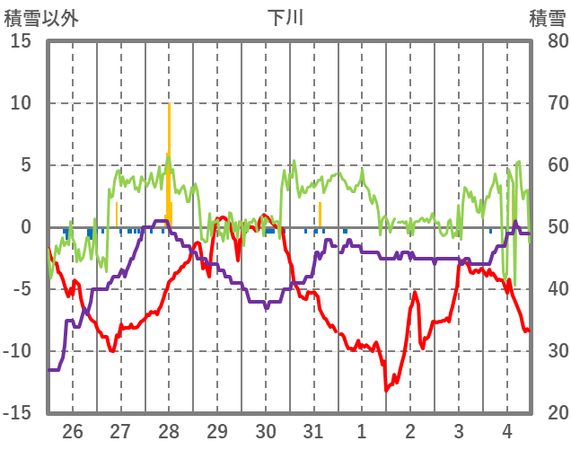 | 日 | 時 | 気温 | 降水 | 風向/風速 | 日照 | 積雪 | 降雪 |
