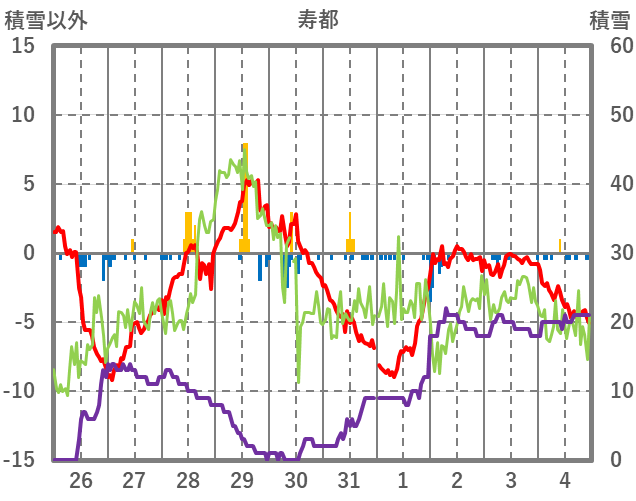 | 日 | 時 | 気温 | 降水 | 風向/風速 | 日照 | 積雪 | 降雪 |