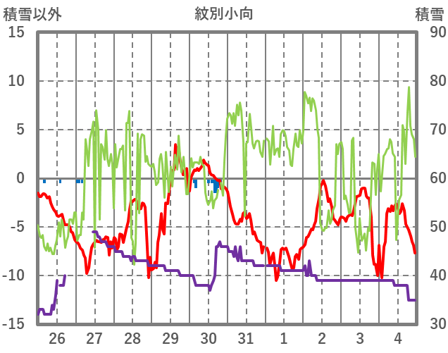 | 日 | 時 | 気温 | 降水 | 風向/風速 | 日照 | 積雪 | 降雪 |