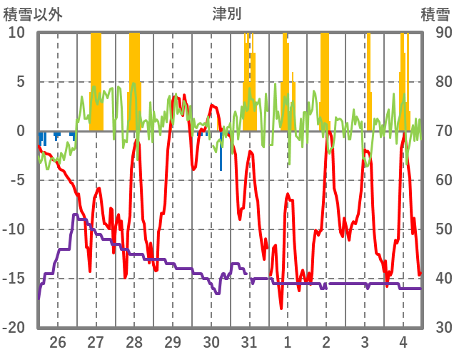 | 日 | 時 | 気温 | 降水 | 風向/風速 | 日照 | 積雪 | 降雪 |