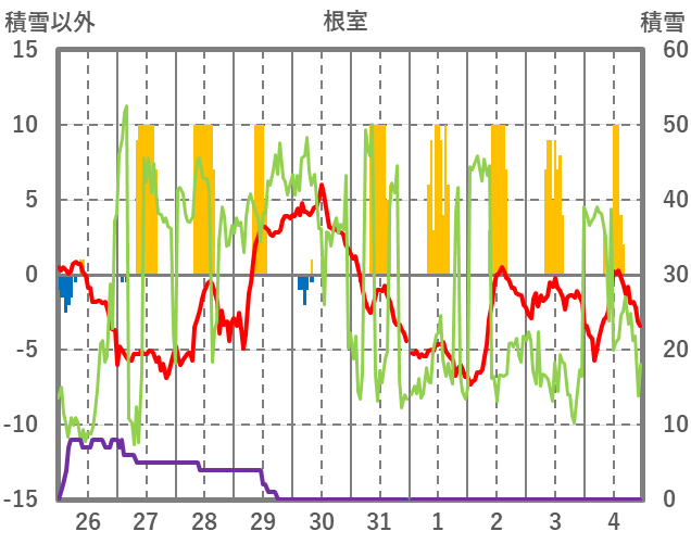 | 日 | 時 | 気温 | 降水 | 風向/風速 | 日照 | 積雪 | 降雪 |