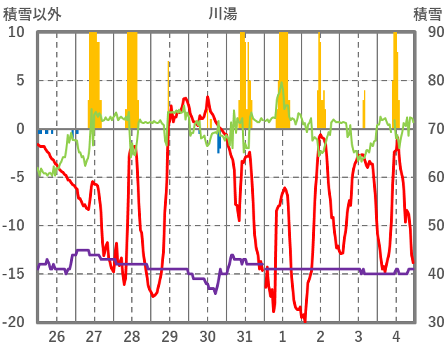 | 日 | 時 | 気温 | 降水 | 風向/風速 | 日照 | 積雪 | 降雪 |