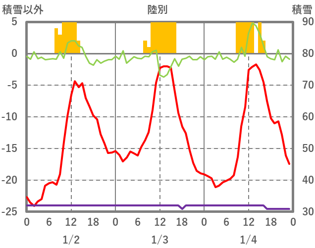 | 日 | 時 | 気温 | 降水 | 風向/風速 | 日照 | 積雪 | 降雪 |