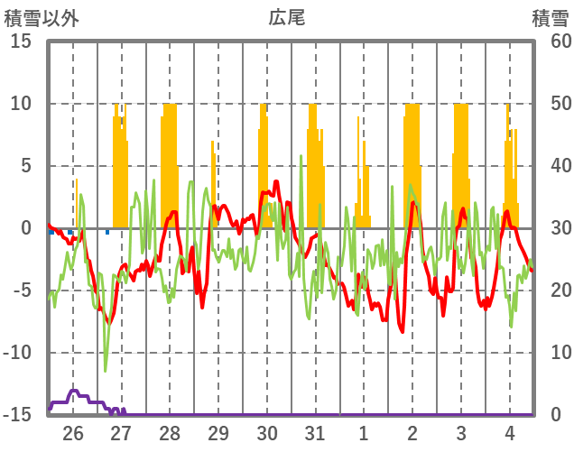 | 日 | 時 | 気温 | 降水 | 風向/風速 | 日照 | 積雪 | 降雪 |