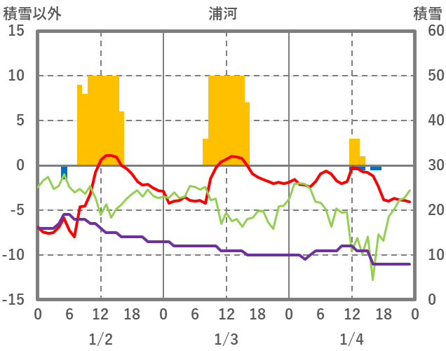 | 日 | 時 | 気温 | 降水 | 風向/風速 | 日照 | 積雪 | 降雪 |
