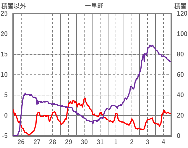 | 日 | 時 | 気温 | 降水 | 風向/風速 | 日照 | 積雪 | 降雪 |