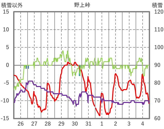 | 日 | 時 | 気温 | 降水 | 風向/風速 | 日照 | 積雪 | 降雪 |