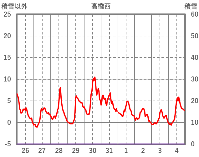 | 日 | 時 | 気温 | 降水 | 風向/風速 | 日照 | 積雪 | 降雪 |