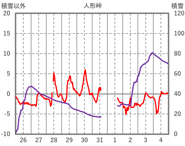 | 日 | 時 | 気温 | 降水 | 風向/風速 | 日照 | 積雪 | 降雪 |