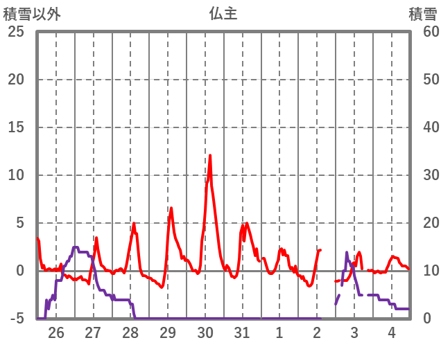 | 日 | 時 | 気温 | 降水 | 風向/風速 | 日照 | 積雪 | 降雪 |