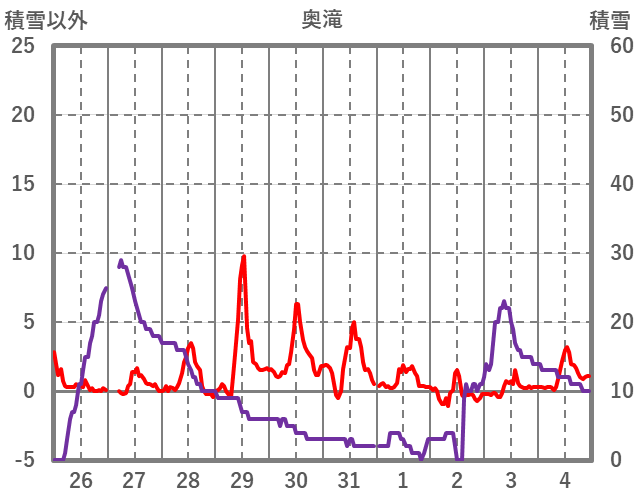 | 日 | 時 | 気温 | 降水 | 風向/風速 | 日照 | 積雪 | 降雪 |