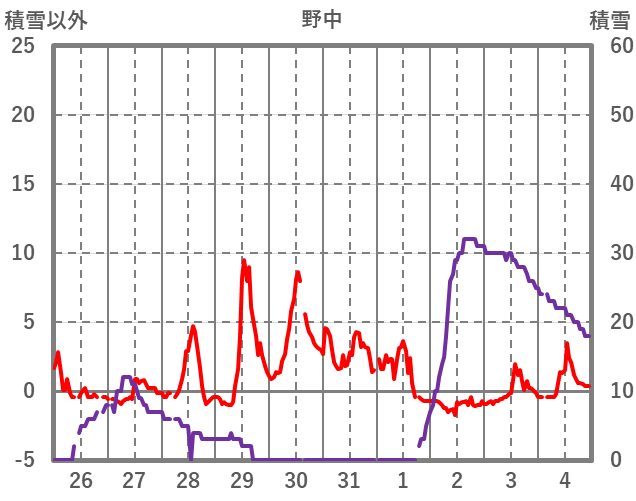 | 日 | 時 | 気温 | 降水 | 風向/風速 | 日照 | 積雪 | 降雪 |