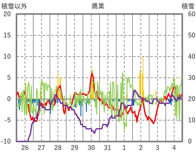 | 日 | 時 | 気温 | 降水 | 風向/風速 | 日照 | 積雪 | 降雪 |