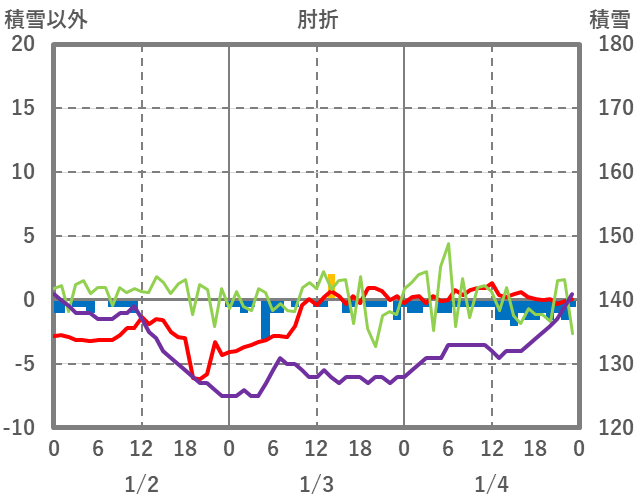 | 日 | 時 | 気温 | 降水 | 風向/風速 | 日照 | 積雪 | 降雪 |