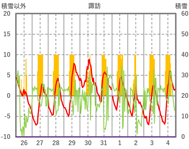 | 日 | 時 | 気温 | 降水 | 風向/風速 | 日照 | 積雪 | 降雪 |