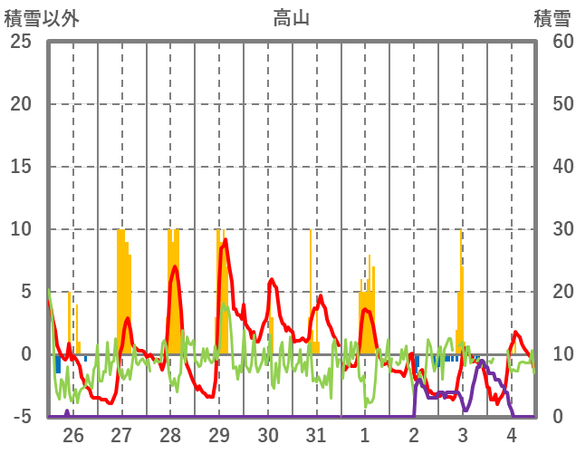 | 日 | 時 | 気温 | 降水 | 風向/風速 | 日照 | 積雪 | 降雪 |