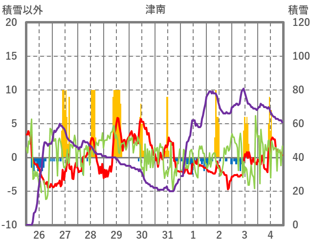 | 日 | 時 | 気温 | 降水 | 風向/風速 | 日照 | 積雪 | 降雪 |