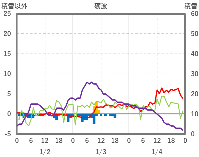 | 日 | 時 | 気温 | 降水 | 風向/風速 | 日照 | 積雪 | 降雪 |