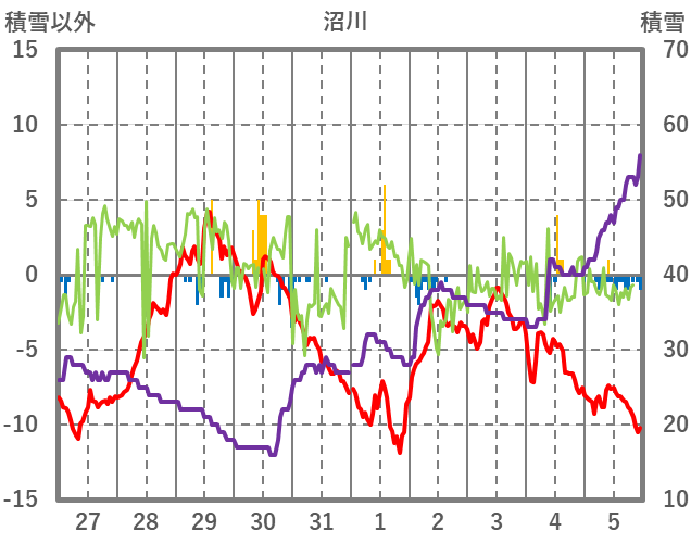 | 日 | 時 | 気温 | 降水 | 風向/風速 | 日照 | 積雪 | 降雪 |