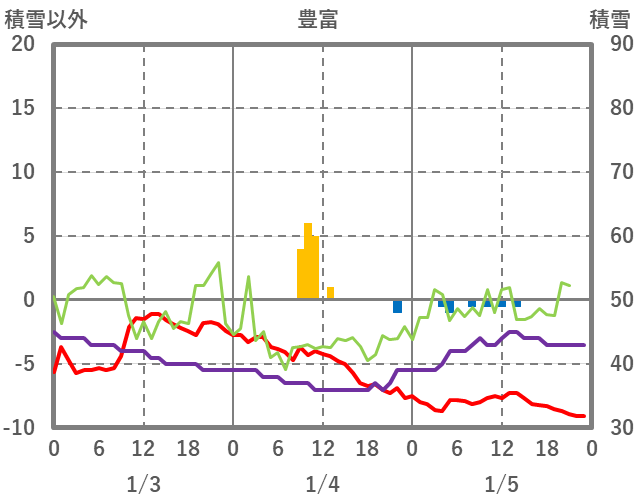 | 日 | 時 | 気温 | 降水 | 風向/風速 | 日照 | 積雪 | 降雪 |