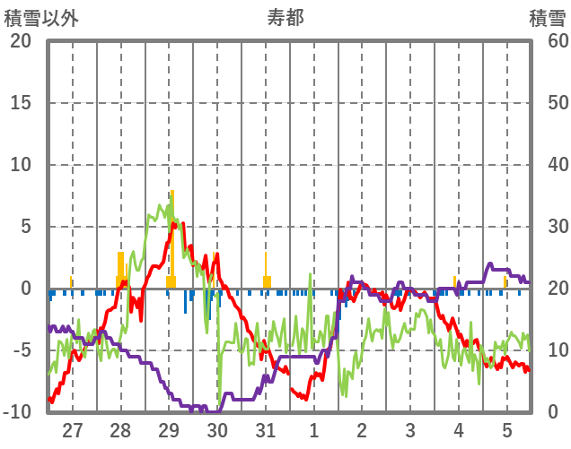 | 日 | 時 | 気温 | 降水 | 風向/風速 | 日照 | 積雪 | 降雪 |