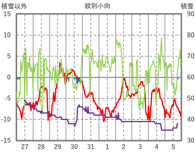| 日 | 時 | 気温 | 降水 | 風向/風速 | 日照 | 積雪 | 降雪 |