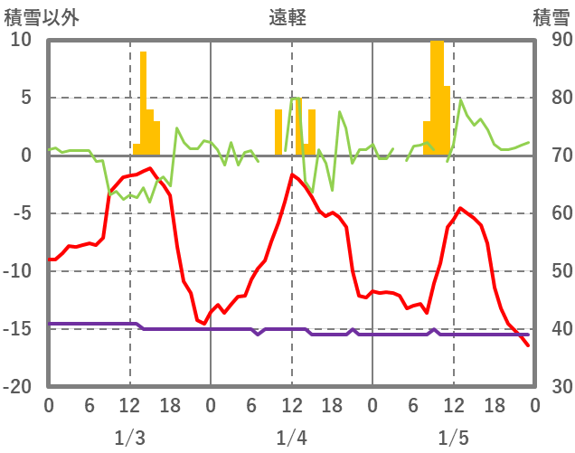 | 日 | 時 | 気温 | 降水 | 風向/風速 | 日照 | 積雪 | 降雪 |